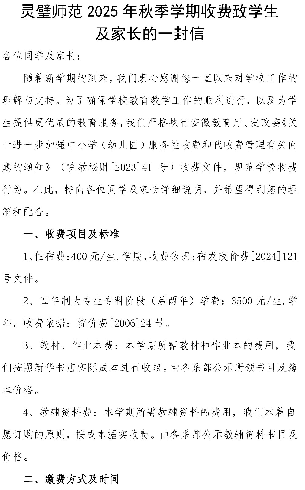灵璧师范学校 2025 年秋季学期收费致学生及家长的一封信